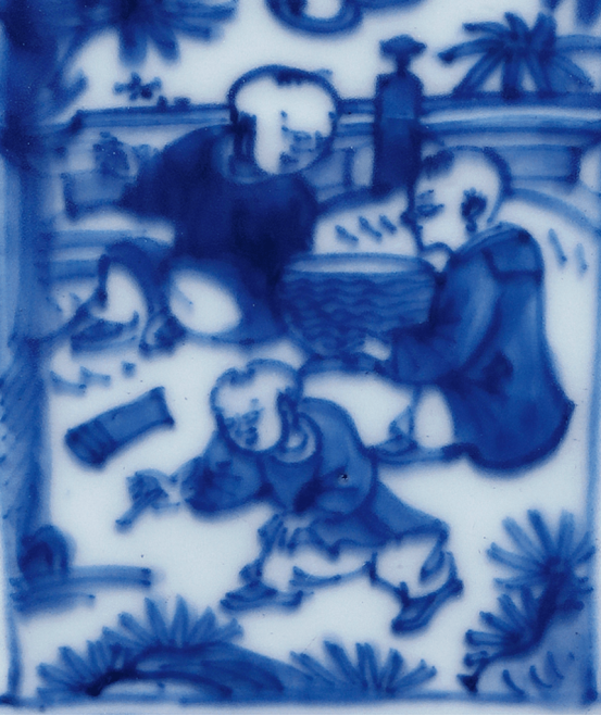 放大觀察畫面中的筆觸:真萬曆的青花線條常帶有變化(粗細交替、起筆收筆自然),如人物衣褶、龍紋鬚毛等部位尤為重要。模仿者往往「形似」但「筆勢不柔活」