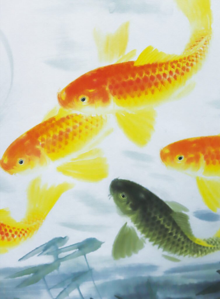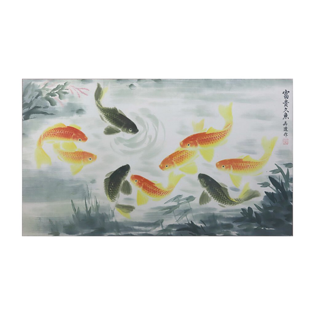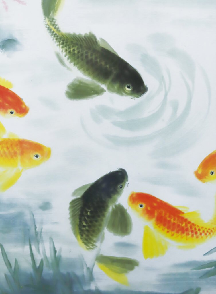 《富貴久魚圖》以“九魚”爲核心意象,“九”諧“久”,“魚”諧“余”,傳遞了“富貴長久,年年有余”的美好祝願。畫中的九條鯉魚,或嬉戲水中,或悠遊自如,布局疏密有致,既有國畫的寫意之美,又通過精細的工筆技法,展現出魚體鱗片的精致細節與水波的輕柔動感,完美融合了工筆與寫意的雙重美學。
