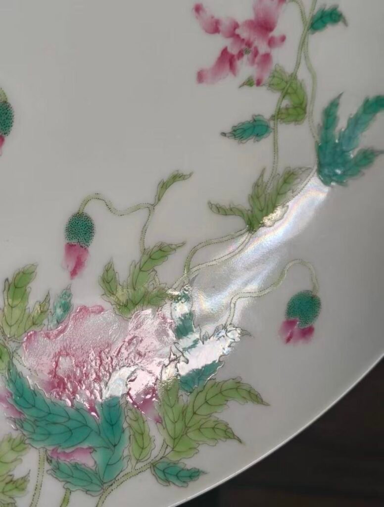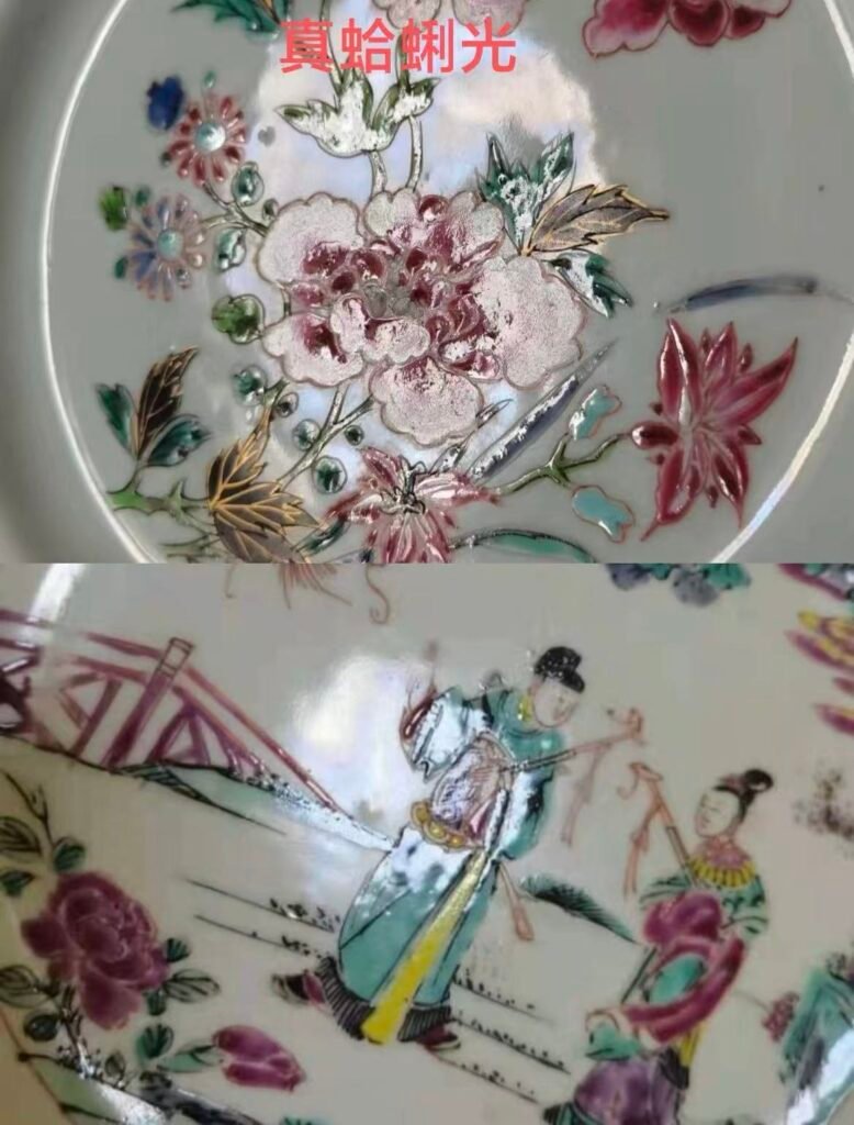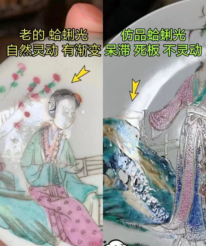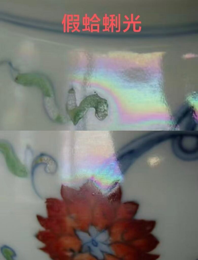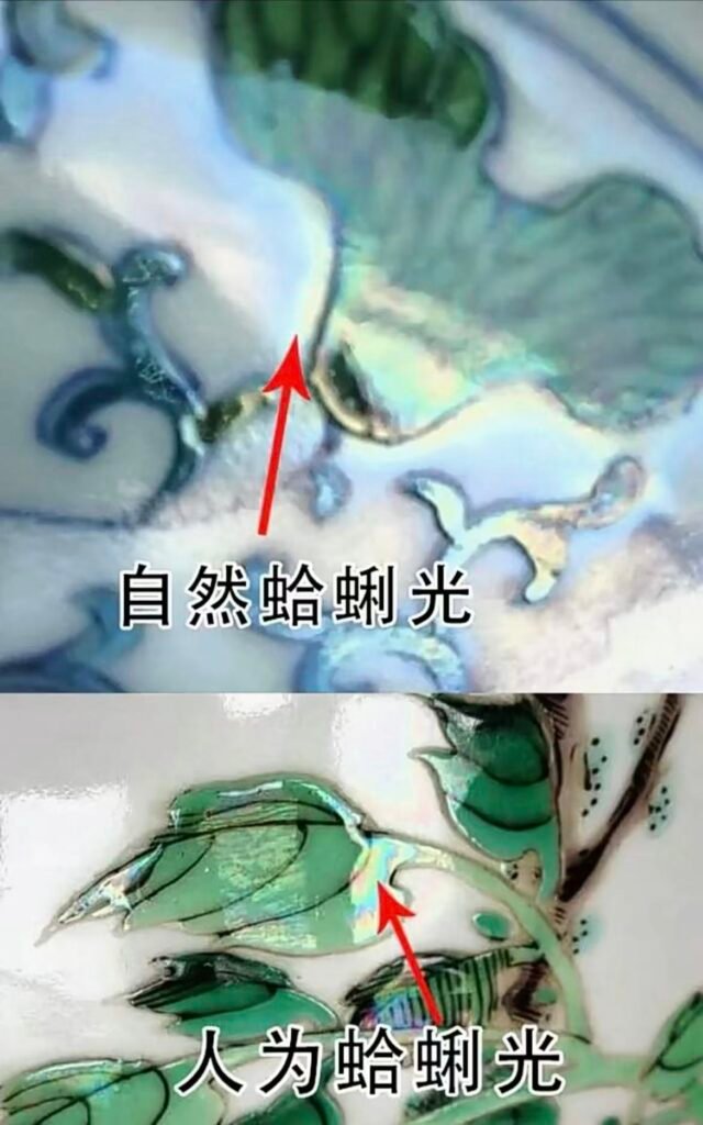 五、對比彩色膜的自然度:真蛤蜊光産生的彩色膜應該是隨著瓷器年代的增長而逐漸形成的,因此看起來更爲自然和和諧。